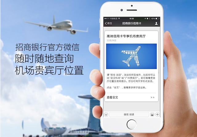 关注招商银行官方微信语音或文字输入“城市+机场”随时随地查询贵宾厅位置